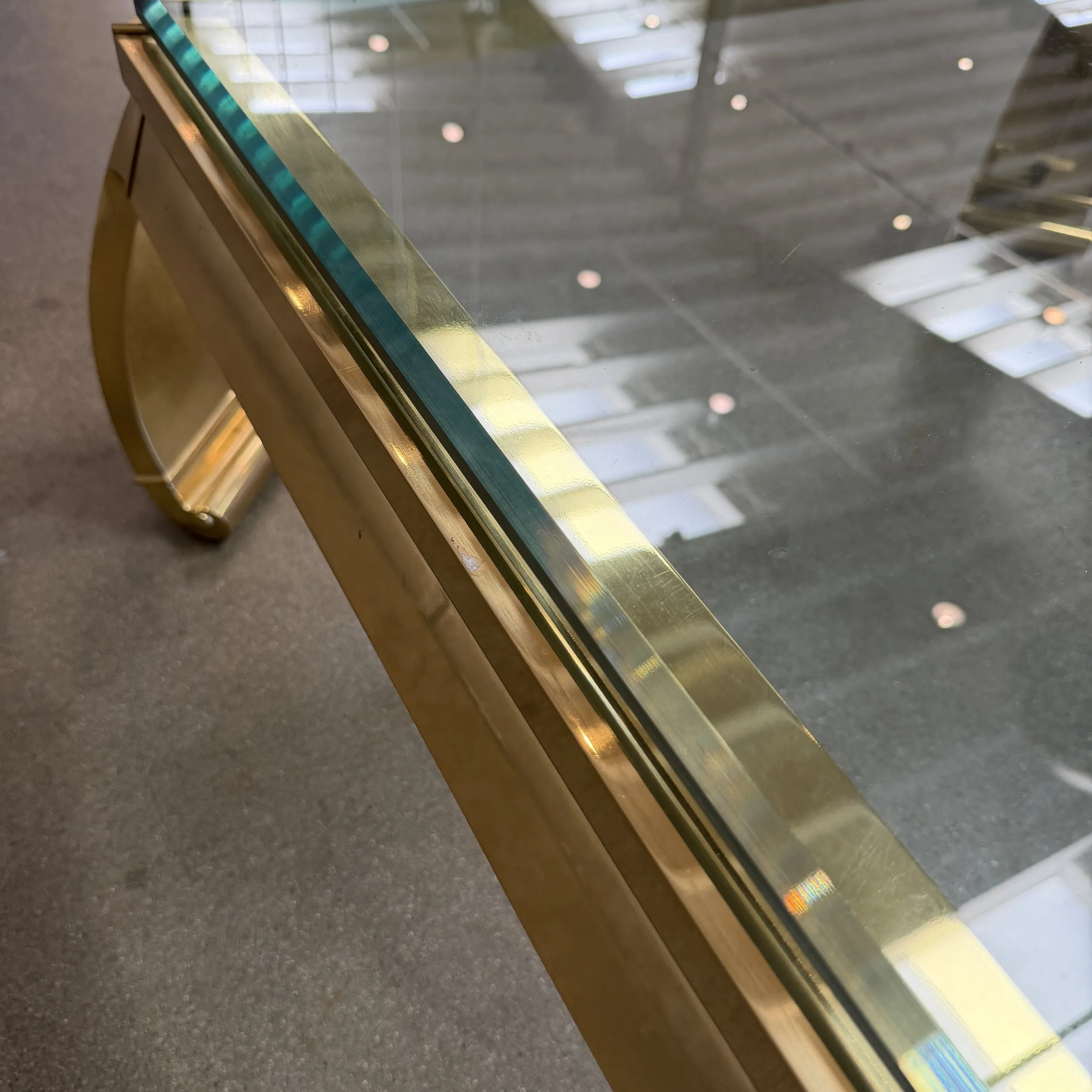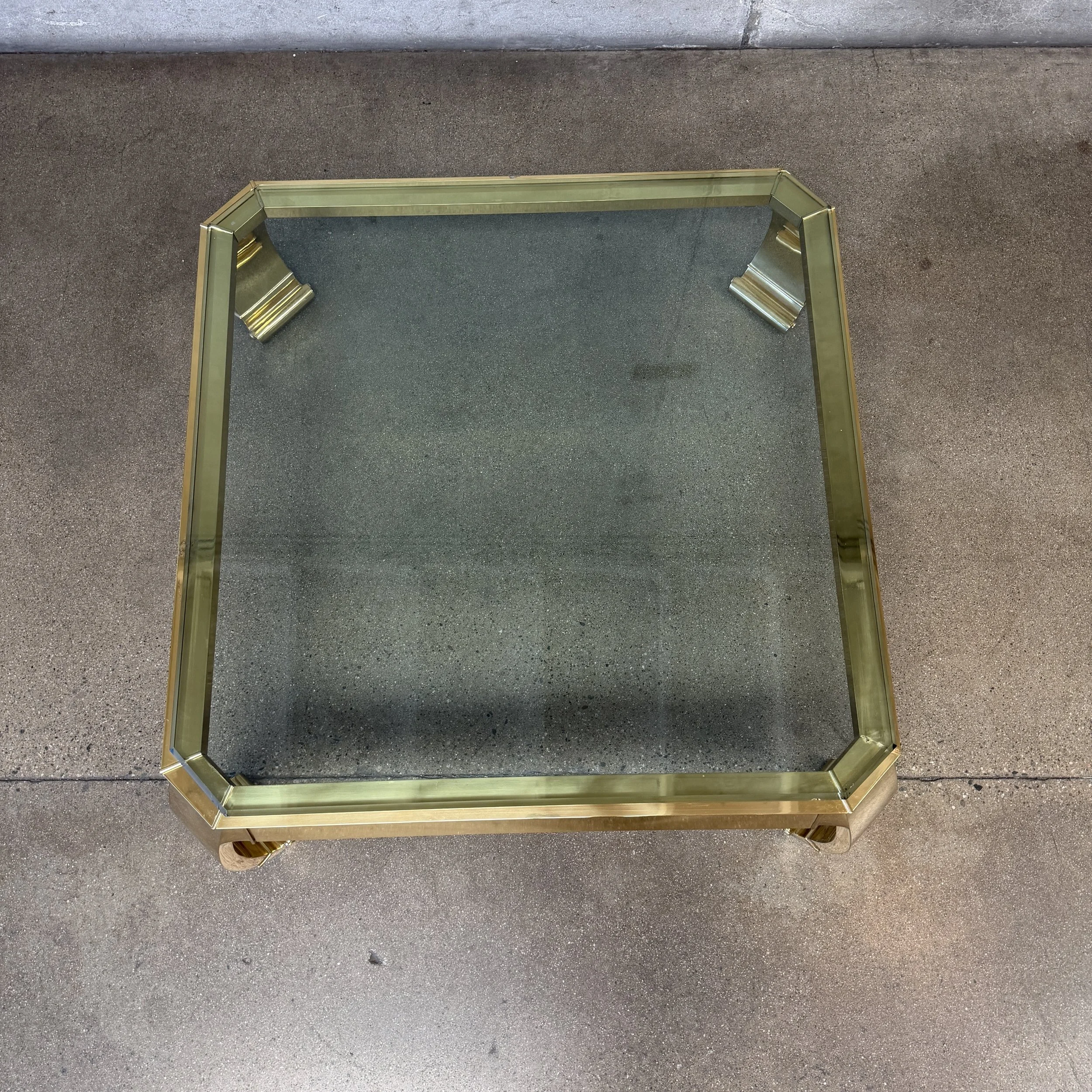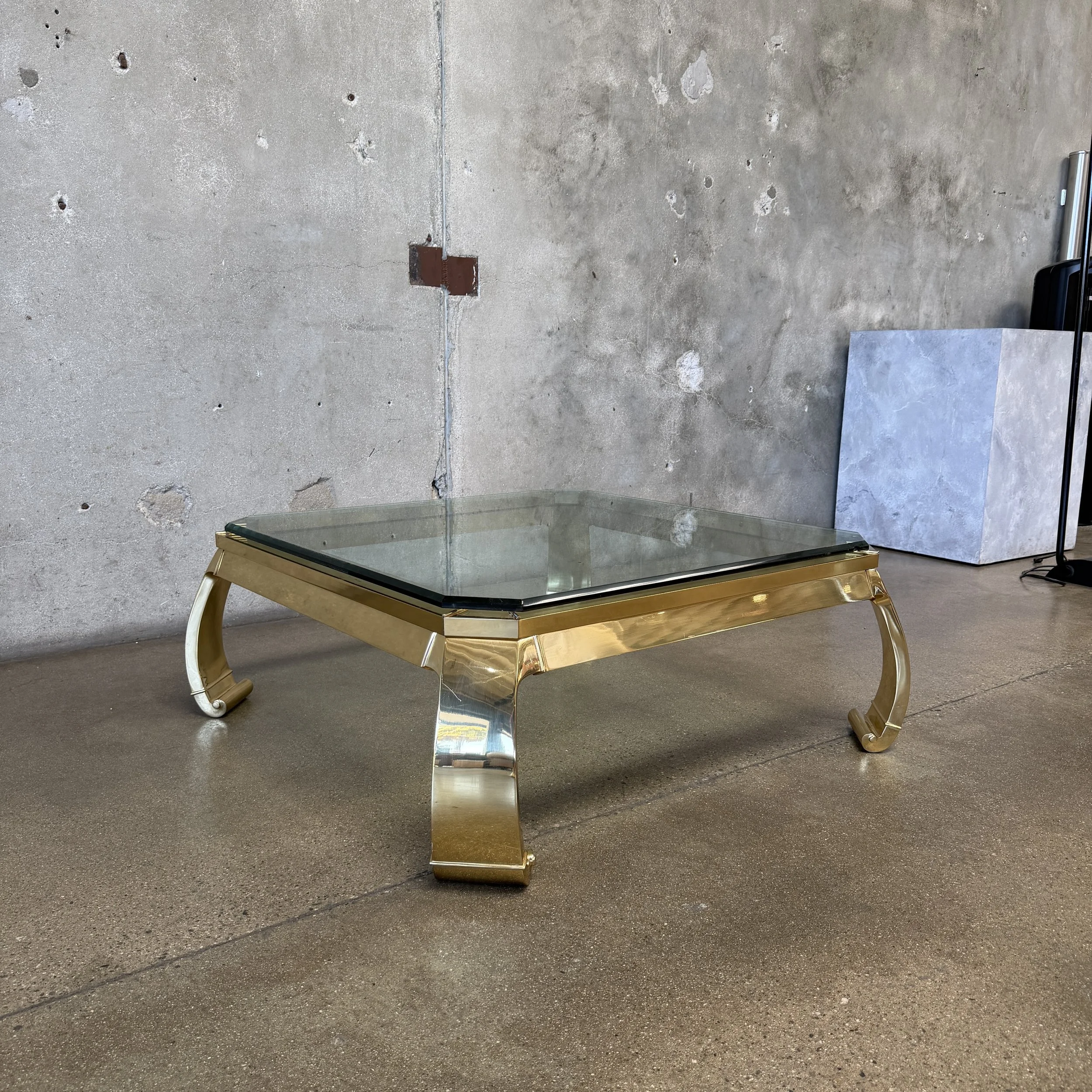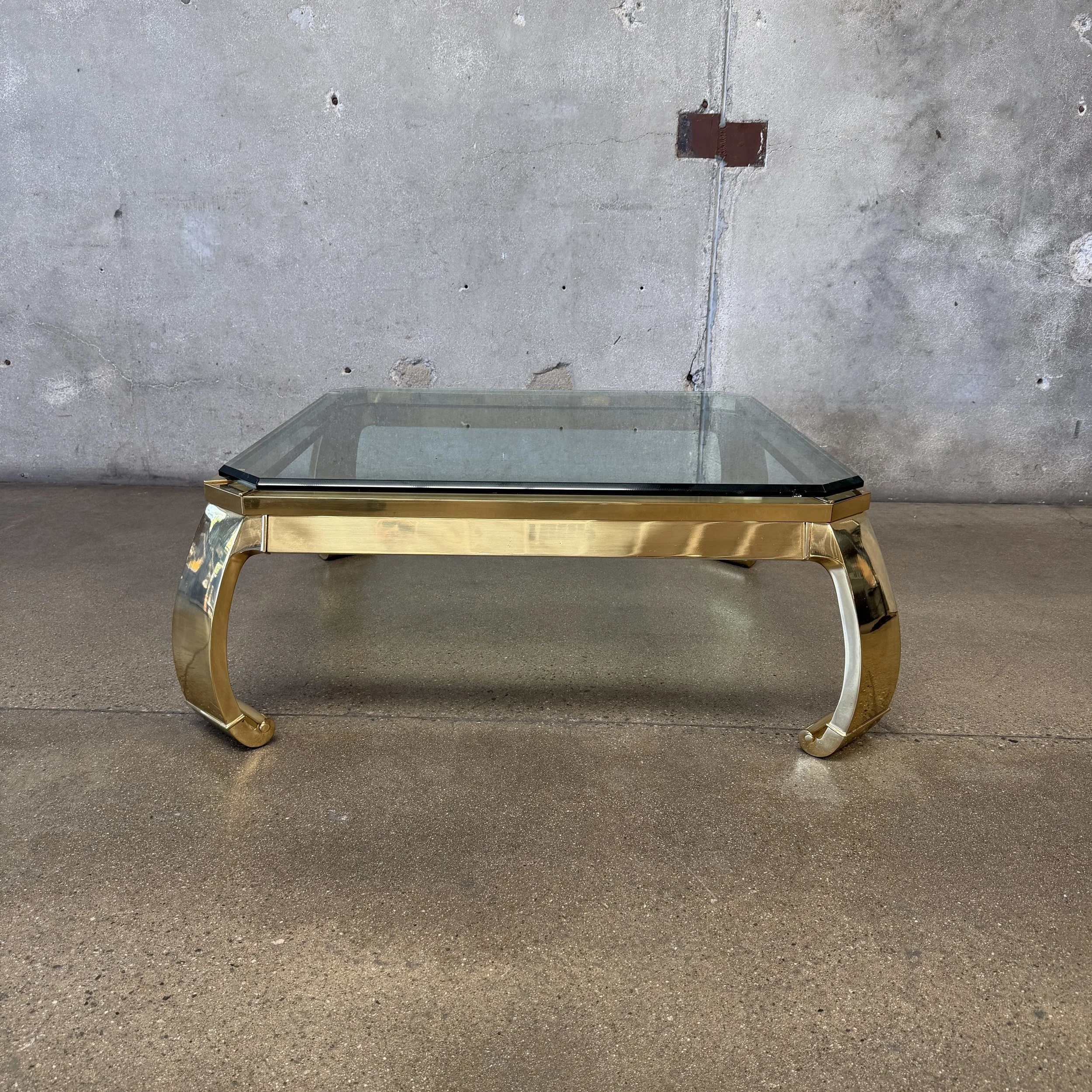 A striking brass coffee table by Mastercraft, defined by the brand’s iconic Ming-inspired silhouette. Waterfall-style legs flow into elegantly curved scroll feet. The octagonal glass top is inset within a faceted brass frame, its subtle bevel catching the light to emphasize the table’s refined geometric shape.
